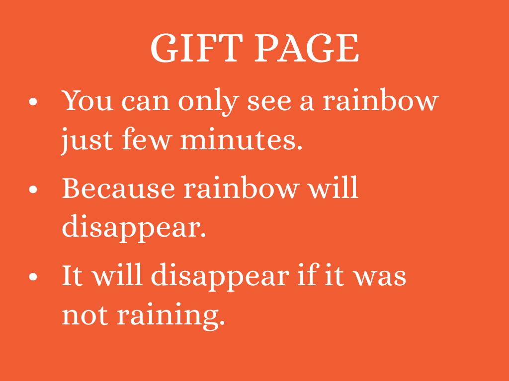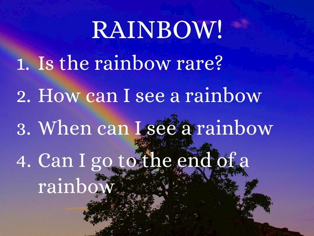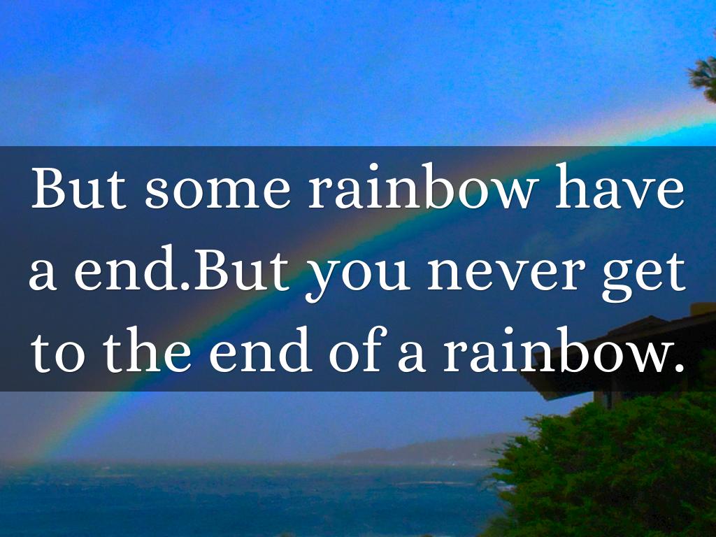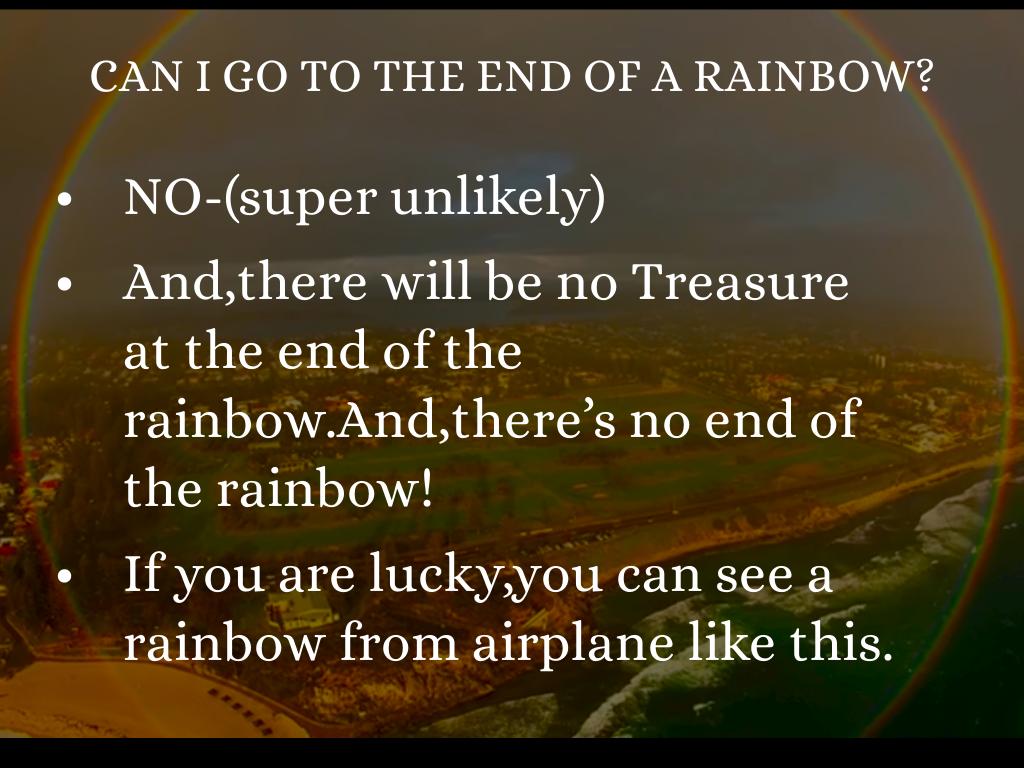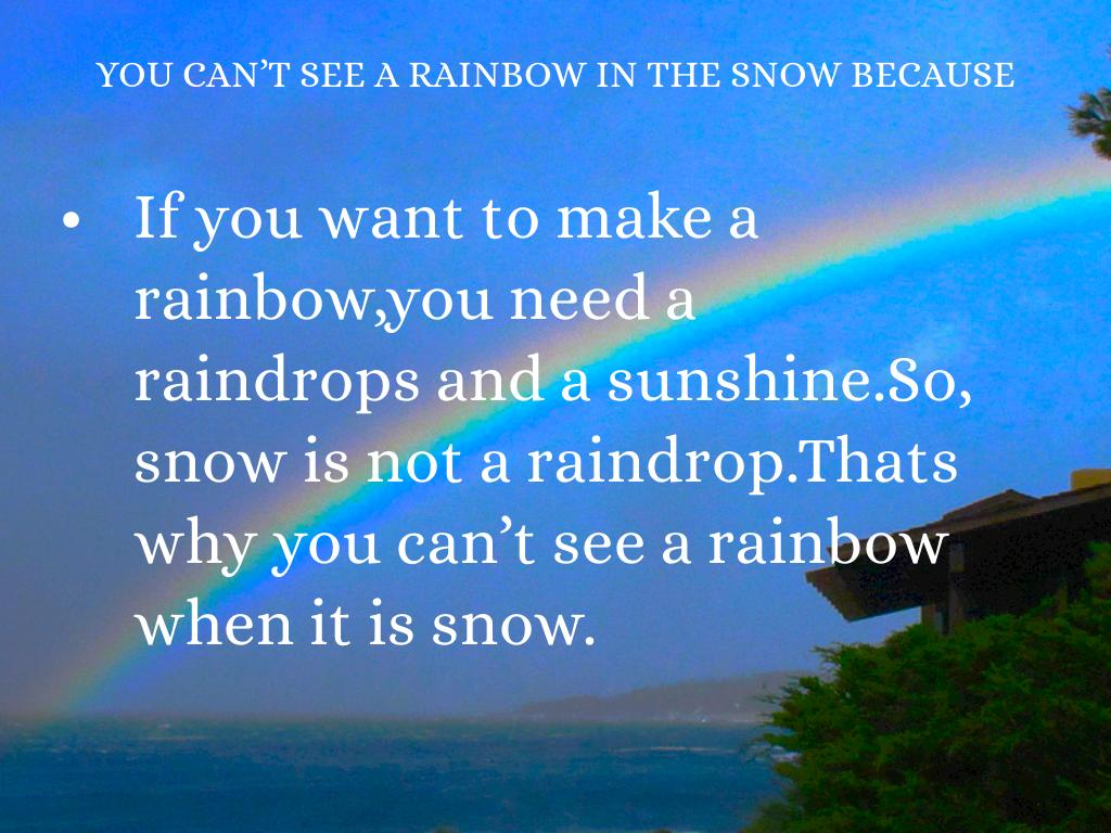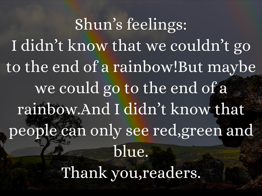 Shun’s feelings: I didn’t know that we couldn’t go to the end of a rainbow!But maybe we could go to the end of a rainbow.And I didn’t know that people can only see red,green and blue. Thank you,readers.