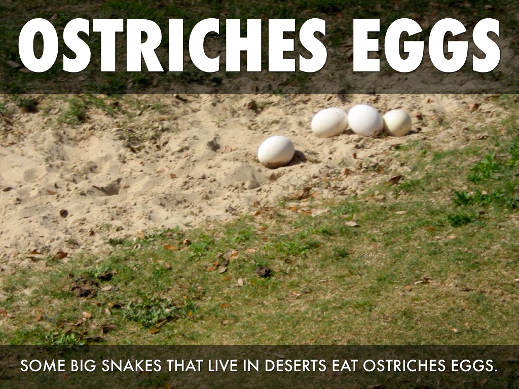 SOME BIG SNAKES THAT LIVE IN DESERTS EAT OSTRICHES EGGS.