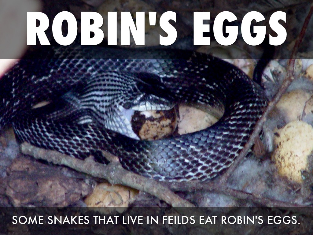 SOME SNAKES THAT LIVE IN FEILDS EAT ROBIN'S EGGS.