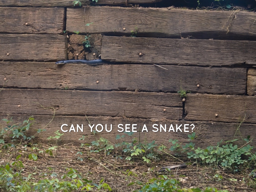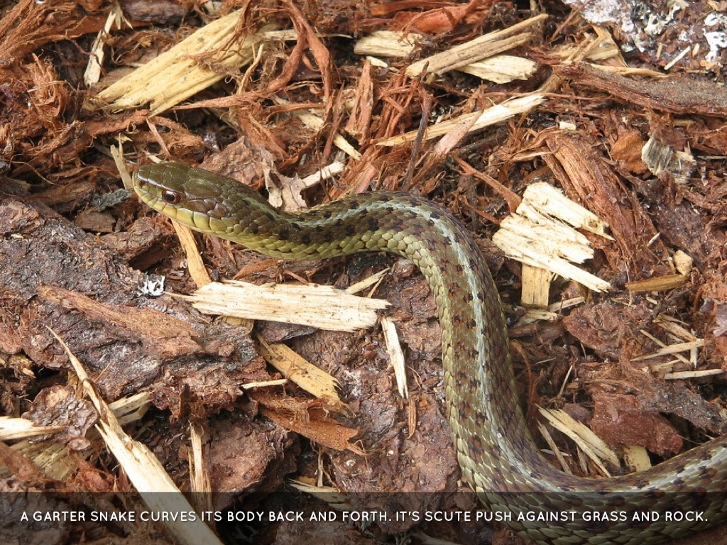 A GARTER SNAKE CURVES ITS BODY BACK AND FORTH. IT'S SCUTE PUSH AGAINST GRASS AND ROCK.