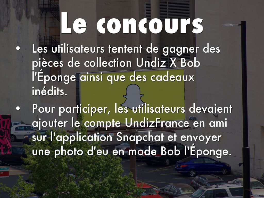 Pour participer, les utilisateurs devaient ajouter le compte UndizFrance en ami sur l'application Snapchat et envoyer une photo d'eu en mode Bob l'Éponge.