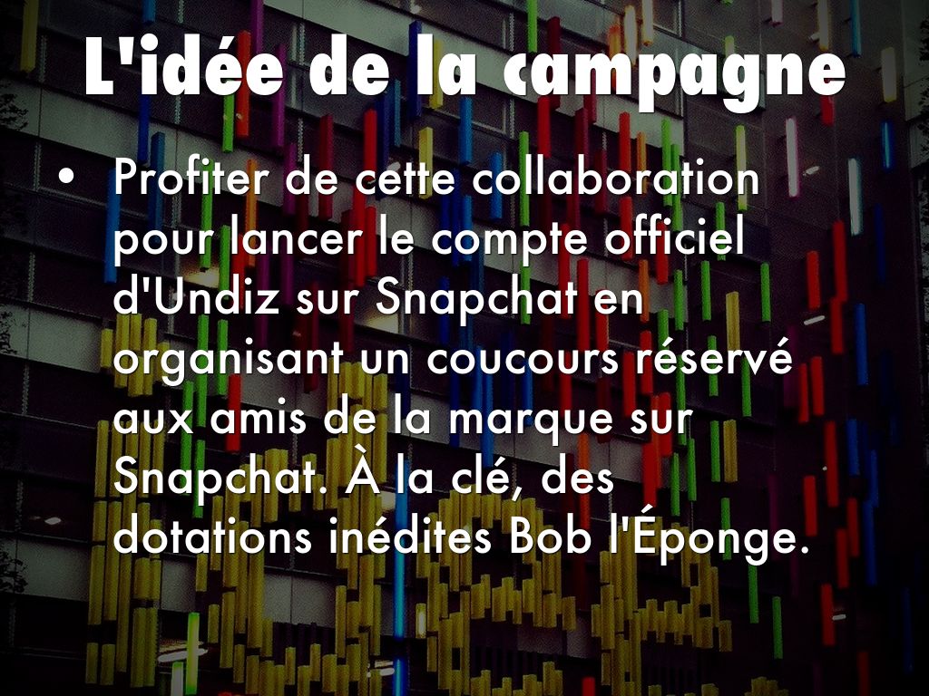 Profiter de cette collaboration pour lancer le compte officiel d'Undiz sur Snapchat en organisant un coucours réservé aux amis de la marque sur Snapchat. À la clé, des dotations inédites Bob l'Éponge.