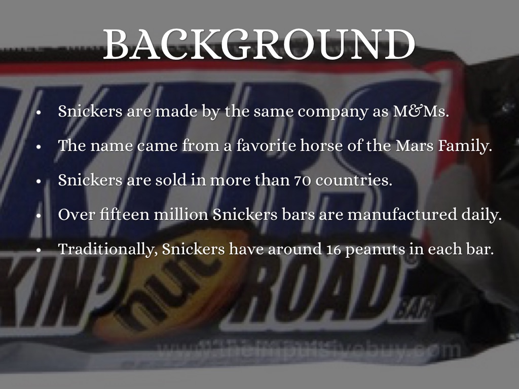 • Traditionally, Snickers have around 16 peanuts in each bar.