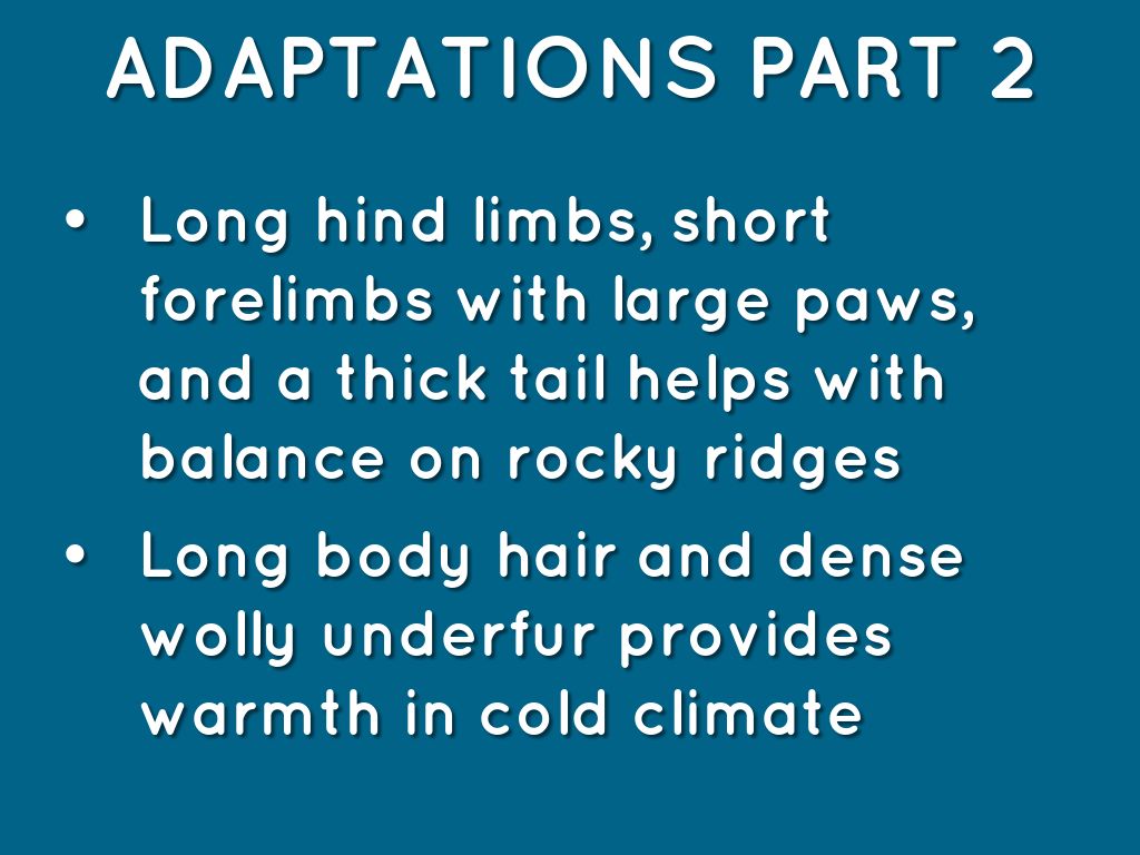 Long hind limbs, short forelimbs with large paws, and a thick tail helps with balance on rocky ridges
