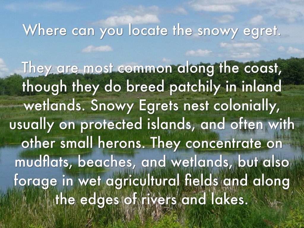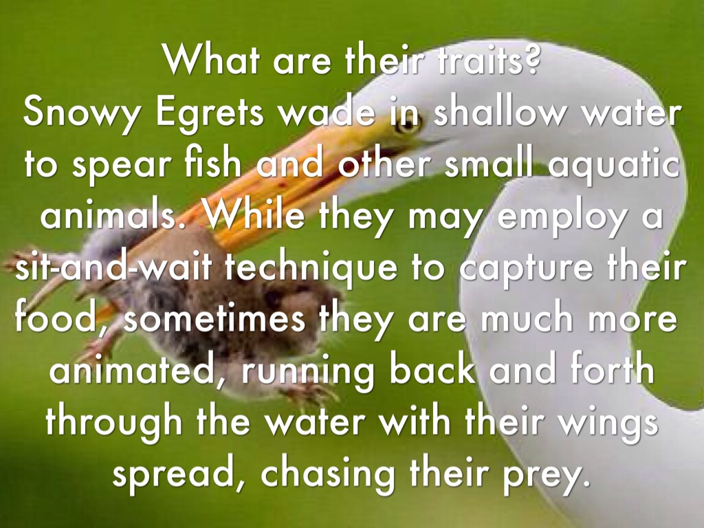 Snowy Egrets wade in shallow water to spear fish and other small aquatic animals. While they may employ a sit-and-wait technique to capture their food, sometimes they are much more animated, running back and forth through the water with their wings spread, chasing their prey.