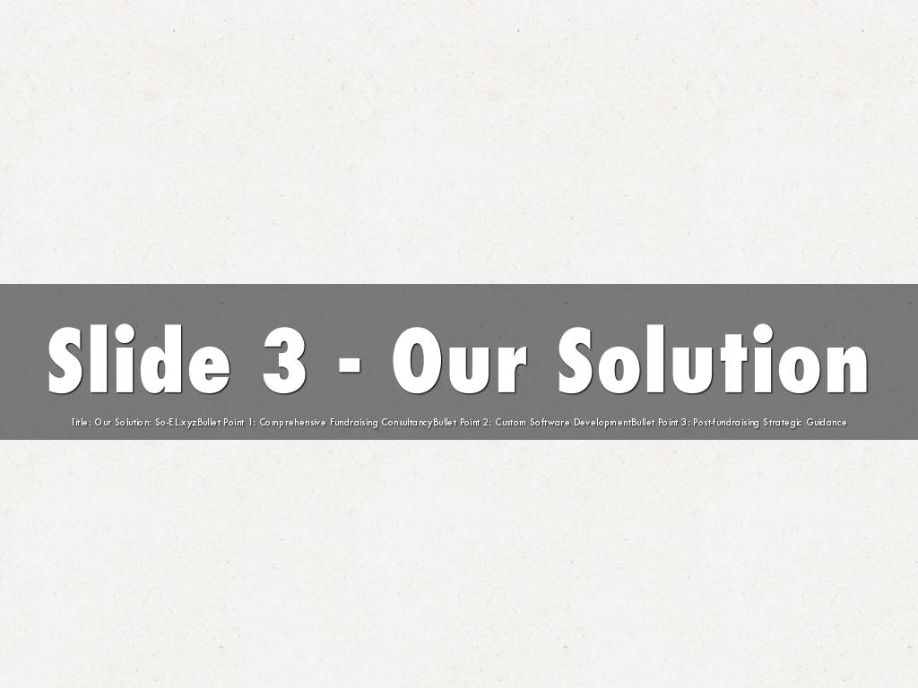Title: Our Solution: So-EL.xyzBullet Point 1: Comprehensive Fundraising ConsultancyBullet Point 2: Custom Software DevelopmentBullet Point 3: Post-fundraising Strategic Guidance
