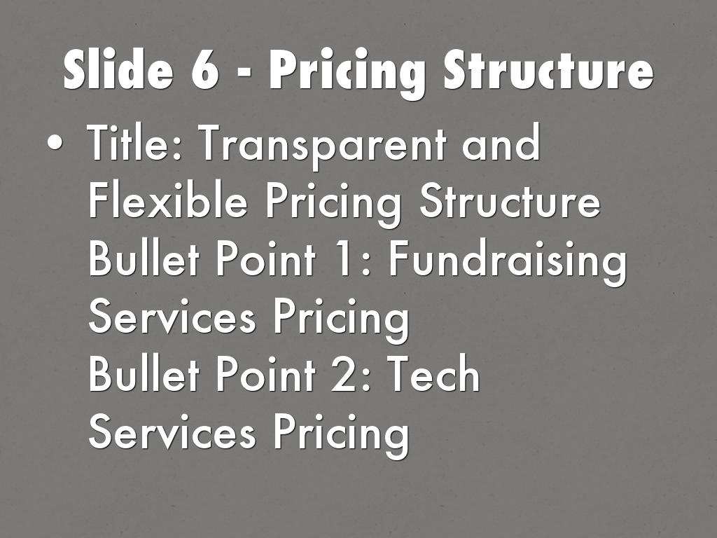 • Title: Transparent and Flexible Pricing Structure Bullet Point 1: Fundraising Services Pricing Bullet Point 2: Tech Services Pricing