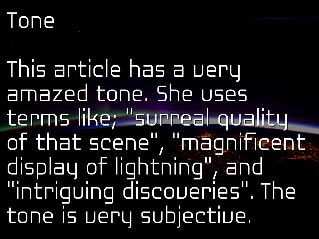 This article has a very amazed tone. She uses terms like; "surreal quality of that scene", "magnificent display of lightning", and "intriguing discoveries". The tone is very subjective.