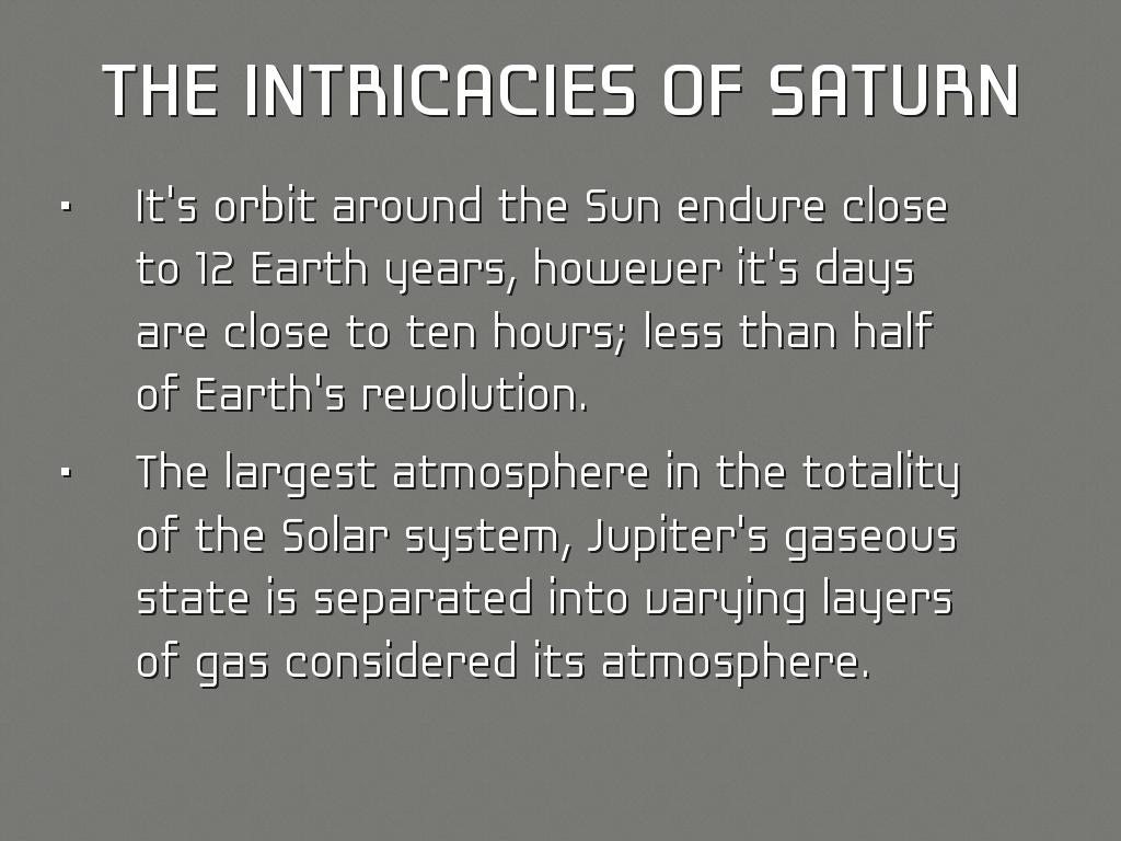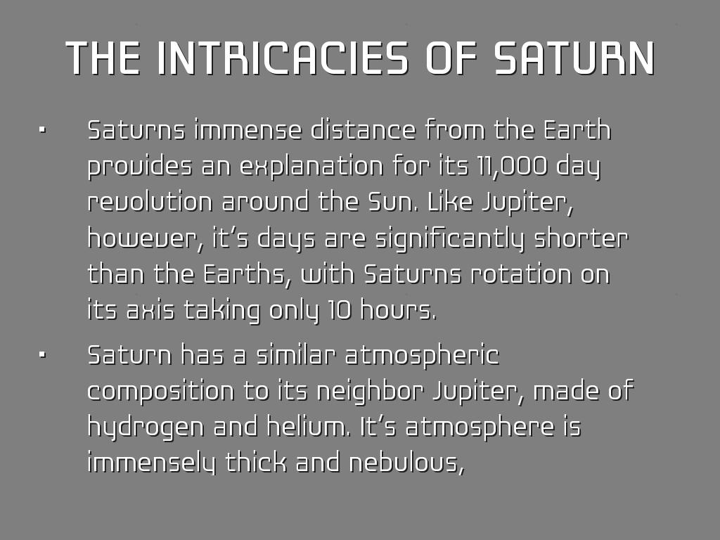 Saturns immense distance from the Earth provides an explanation for its 11,000 day revolution around the Sun. Like Jupiter, however, it’s days are significantly shorter than the Earths, with Saturns rotation on its axis taking only 10 hours.