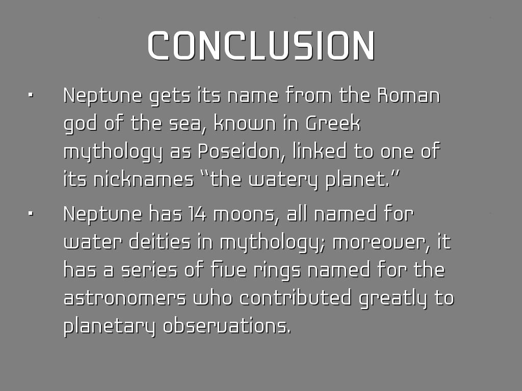 Neptune has 14 moons, all named for water deities in mythology; moreover, it has a series of five rings named for the astronomers who contributed greatly to planetary observations.