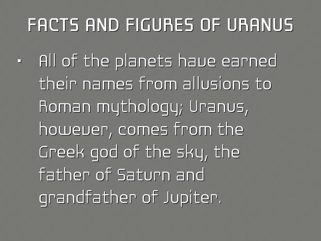All of the planets have earned their names from allusions to Roman mythology; Uranus, however, comes from the Greek god of the sky, the father of Saturn and grandfather of Jupiter.