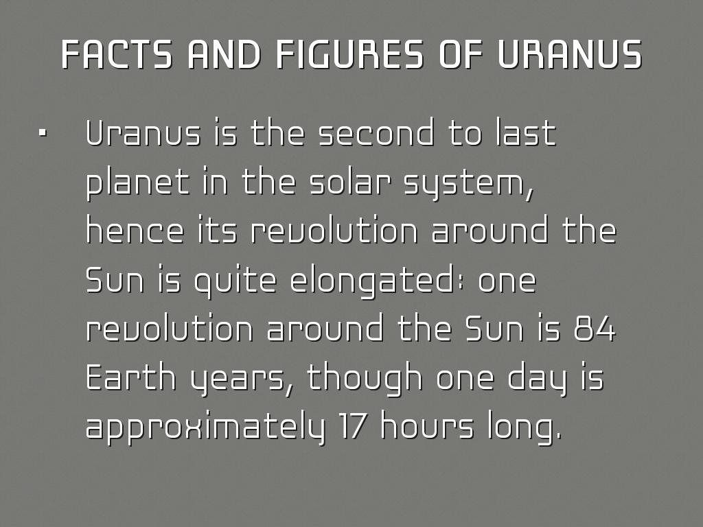 Uranus is the second to last planet in the solar system, hence its revolution around the Sun is quite elongated: one revolution around the Sun is 84 Earth years, though one day is approximately 17 hours long.