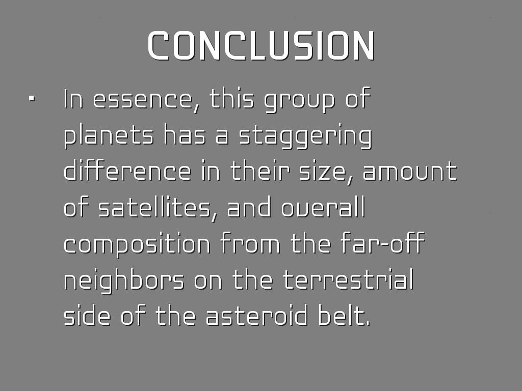 In essence, this group of planets has a staggering difference in their size, amount of satellites, and overall composition from the far-off neighbors on the terrestrial side of the asteroid belt.
