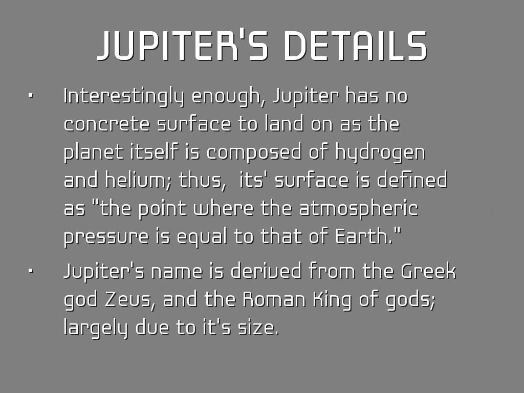 Jupiter's name is derived from the Greek god Zeus, and the Roman King of gods; largely due to it's size.