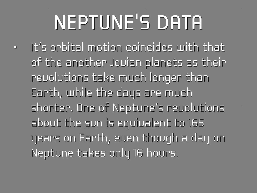It’s orbital motion coincides with that of the another Jovian planets as their revolutions take much longer than Earth, while the days are much shorter. One of Neptune’s revolutions about the sun is equivalent to 165 years on Earth, even though a day on Neptune takes only 16 hours.