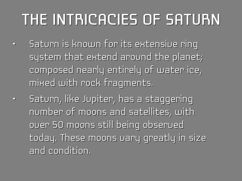 Saturn, like Jupiter, has a staggering number of moons and satellites, with over 50 moons still being observed today. These moons vary greatly in size and condition.