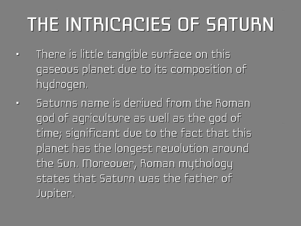 Saturns name is derived from the Roman god of agriculture as well as the god of time; significant due to the fact that this planet has the longest revolution around the Sun. Moreover, Roman mythology states that Saturn was the father of Jupiter.