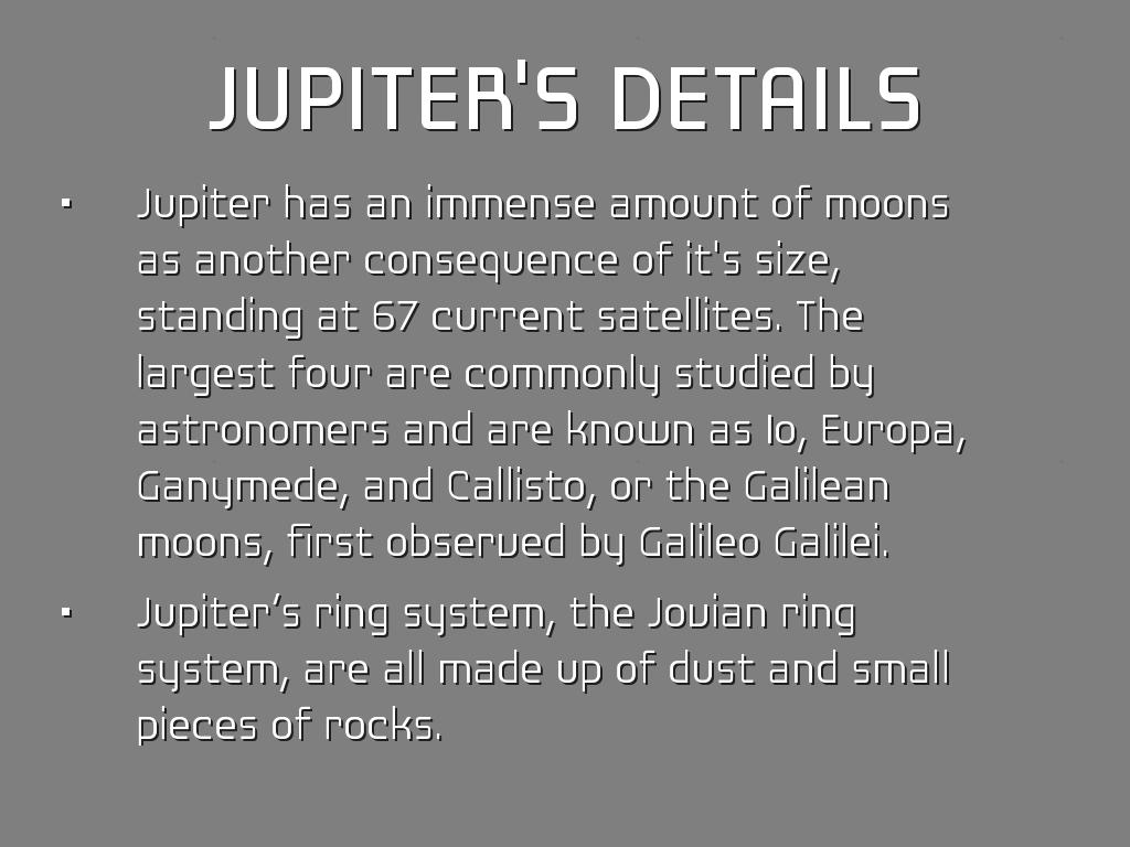 Jupiter has an immense amount of moons as another consequence of it's size, standing at 67 current satellites. The largest four are commonly studied by astronomers and are known as Io, Europa, Ganymede, and Callisto, or the Galilean moons, first observed by Galileo Galilei.