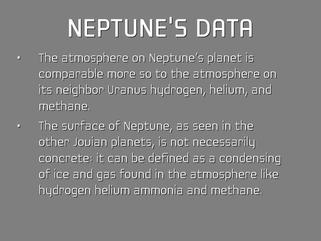 The surface of Neptune, as seen in the other Jovian planets, is not necessarily concrete: it can be defined as a condensing of ice and gas found in the atmosphere like hydrogen helium ammonia and methane.