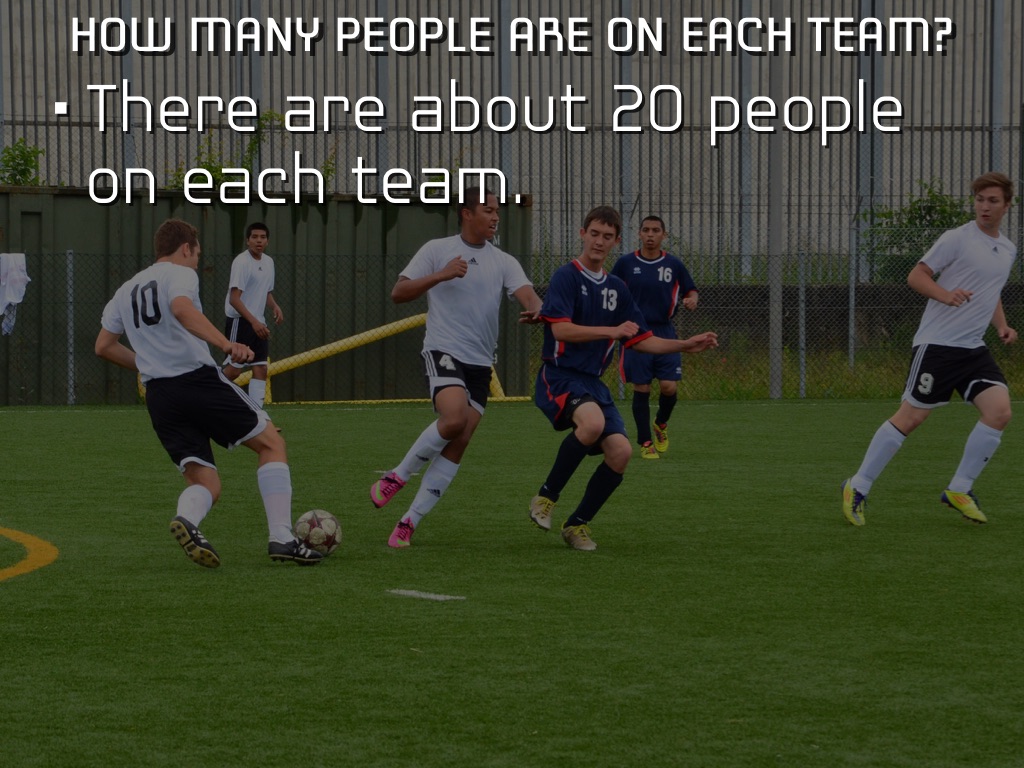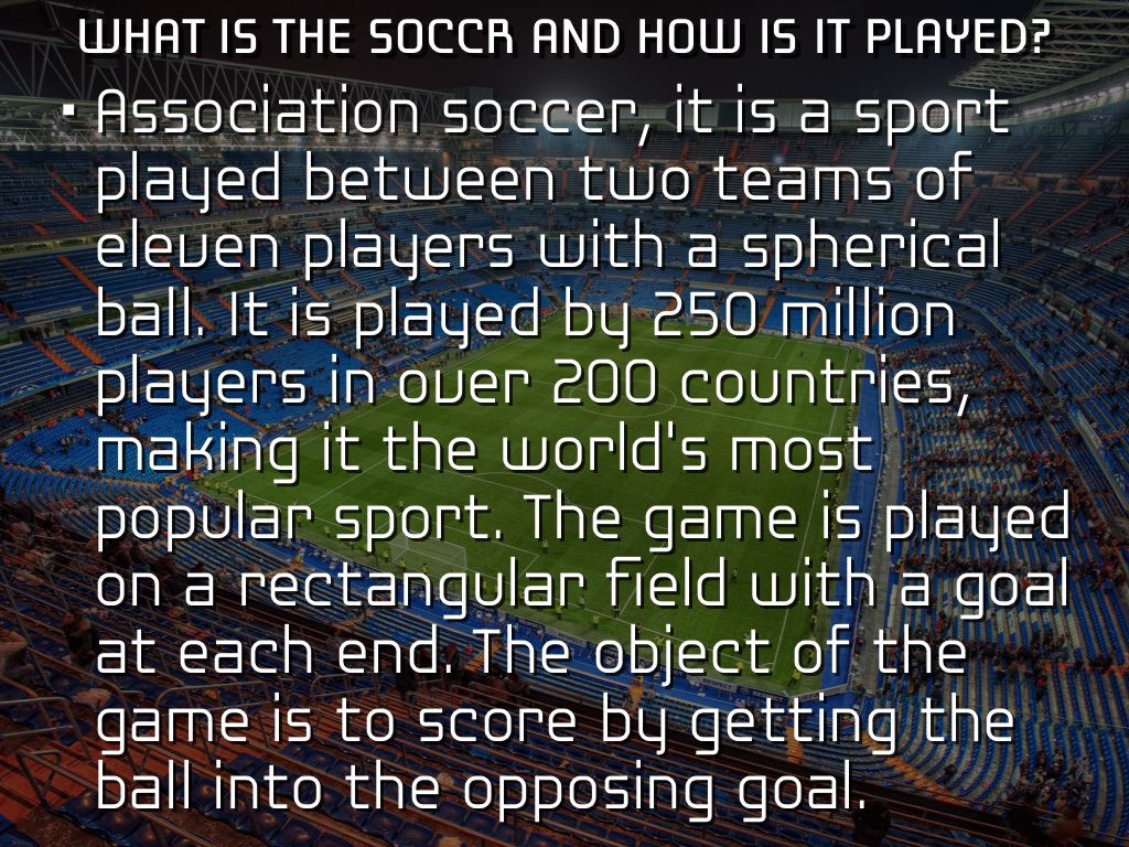 • Association soccer, it is a sport played between two teams of eleven players with a spherical ball. It is played by 250 million players in over 200 countries, making it the world's most popular sport. The game is played on a rectangular field with a goal at each end. The object of the game is to score by getting the ball into the opposing goal.