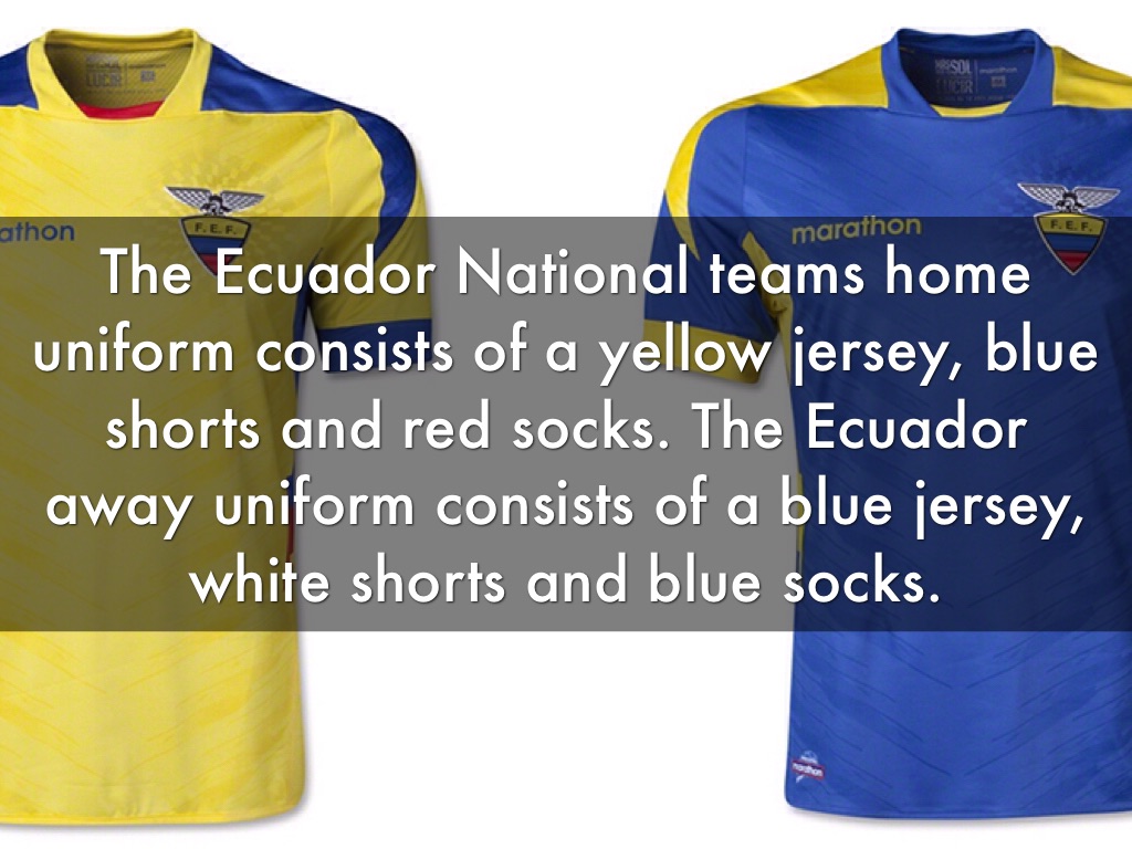 The Ecuador National teams home uniform consists of a yellow jersey, blue shorts and red socks. The Ecuador away uniform consists of a blue jersey, white shorts and blue socks.