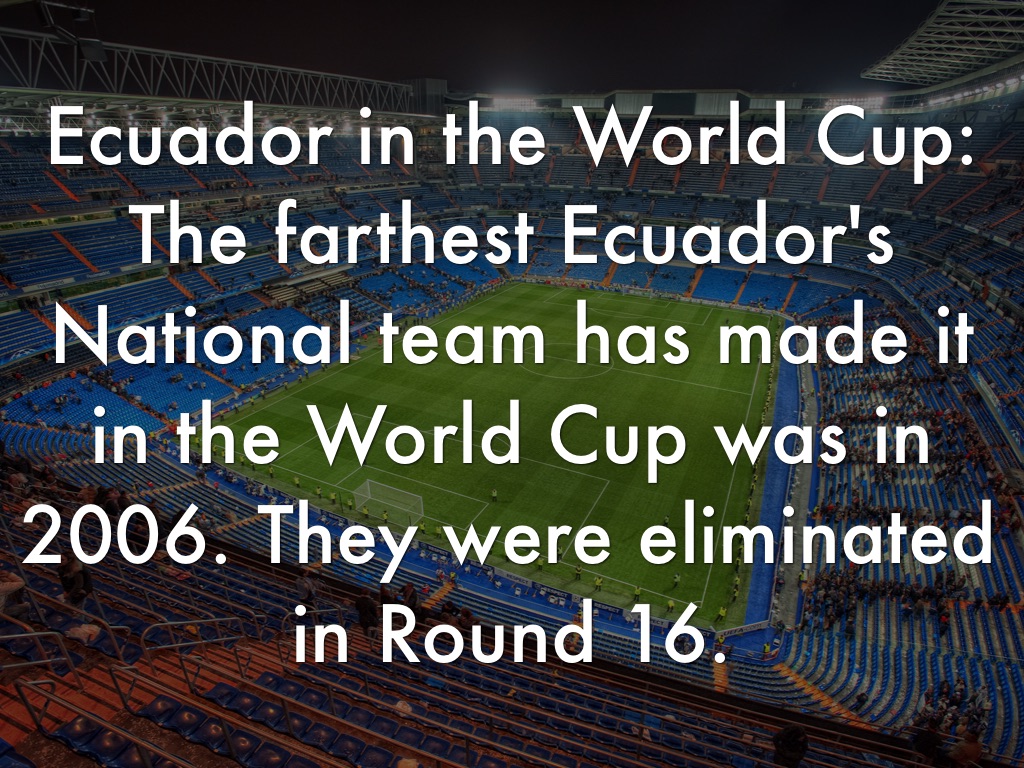 The farthest Ecuador's National team has made it in the World Cup was in 2006. They were eliminated in Round 16.