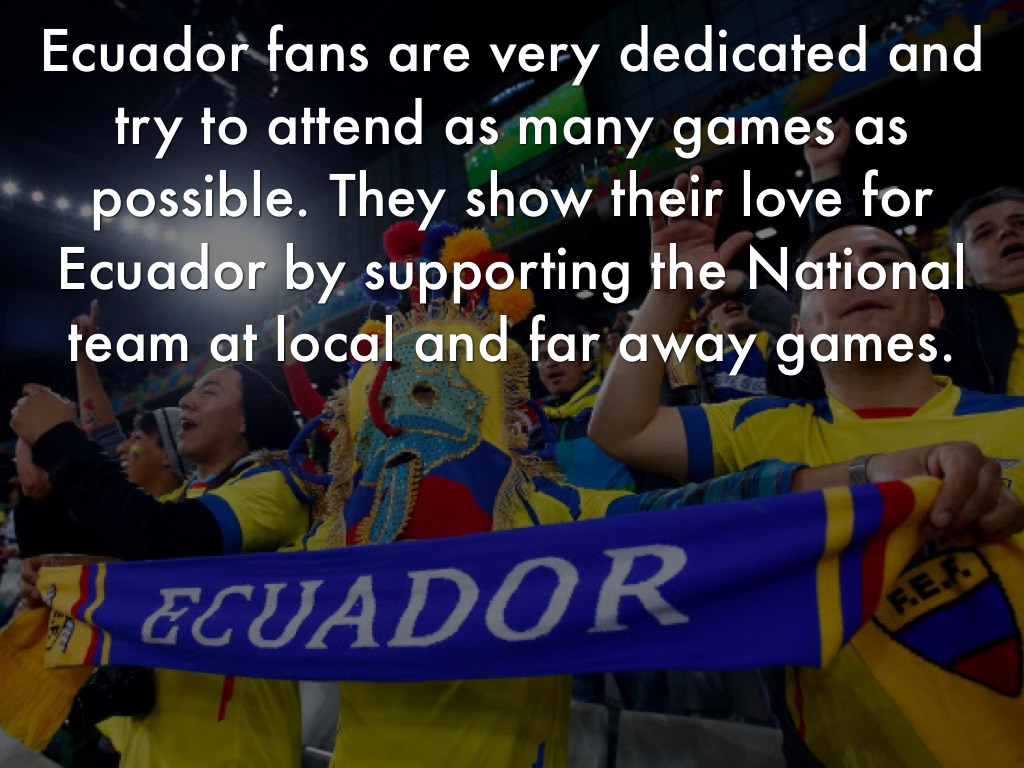 Ecuador fans are very dedicated and try to attend as many games as possible. They show their love for Ecuador by supporting the National team at local and far away games.