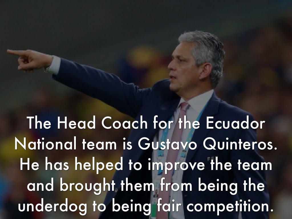 The Head Coach for the Ecuador National team is Gustavo Quinteros. He has helped to improve the team and brought them from being the underdog to being fair competition.