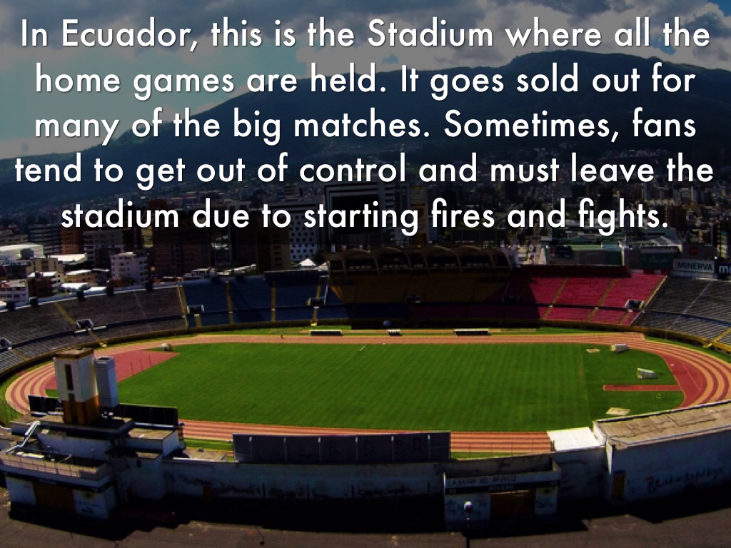 In Ecuador, this is the Stadium where all the home games are held. It goes sold out for many of the big matches. Sometimes, fans tend to get out of control and must leave the stadium due to starting fires and fights.