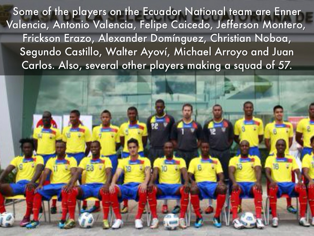 Some of the players on the Ecuador National team are Enner Valencia, Antonio Valencia, Felipe Caicedo, Jefferson Montero, Frickson Erazo, Alexander Domínguez, Christian Noboa, Segundo Castillo, Walter Ayoví, Michael Arroyo and Juan Carlos. Also, several other players making a squad of 57.