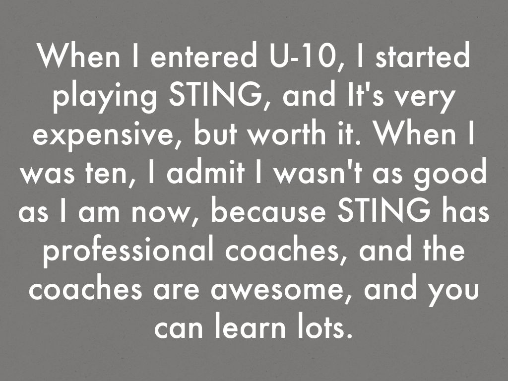 When I entered U-10, I started playing STING, and It's very expensive, but worth it. When I was ten, I admit I wasn't as good as I am now, because STING has professional coaches, and the coaches are awesome, and you can learn lots.