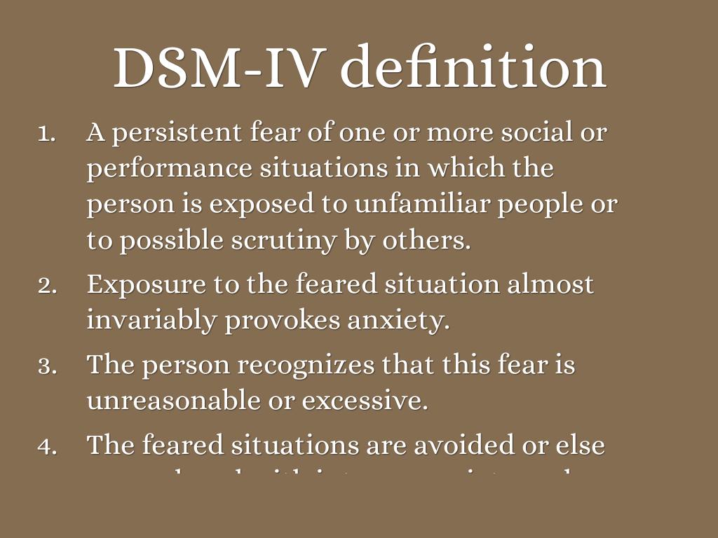 A persistent fear of one or more social or performance situations in which the person is exposed to unfamiliar people or to possible scrutiny by others.