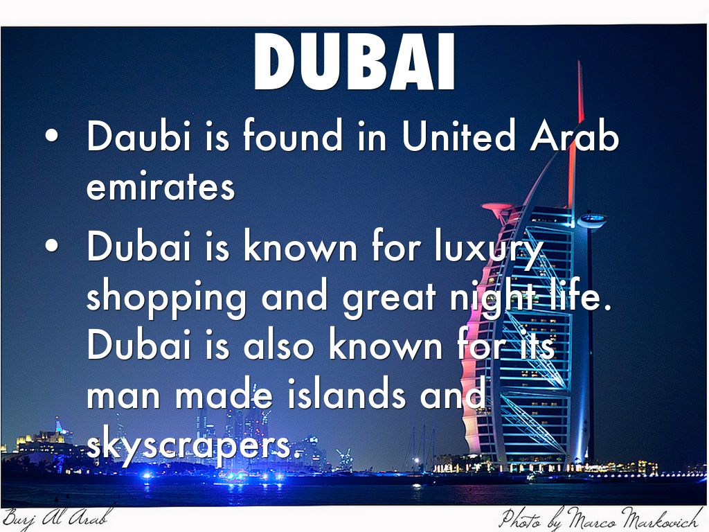 Dubai is known for luxury shopping and great night life. Dubai is also known for its man made islands and skyscrapers.