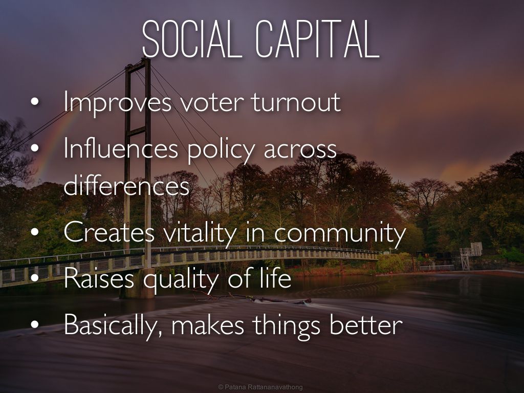 Social Capital is the collective value of all your networks (who you know) and the inclination of these to do things for one another. (Harvard Kennedy School)