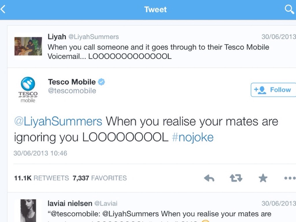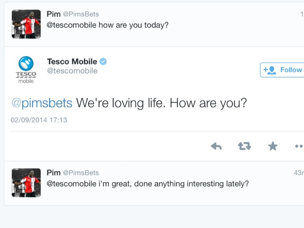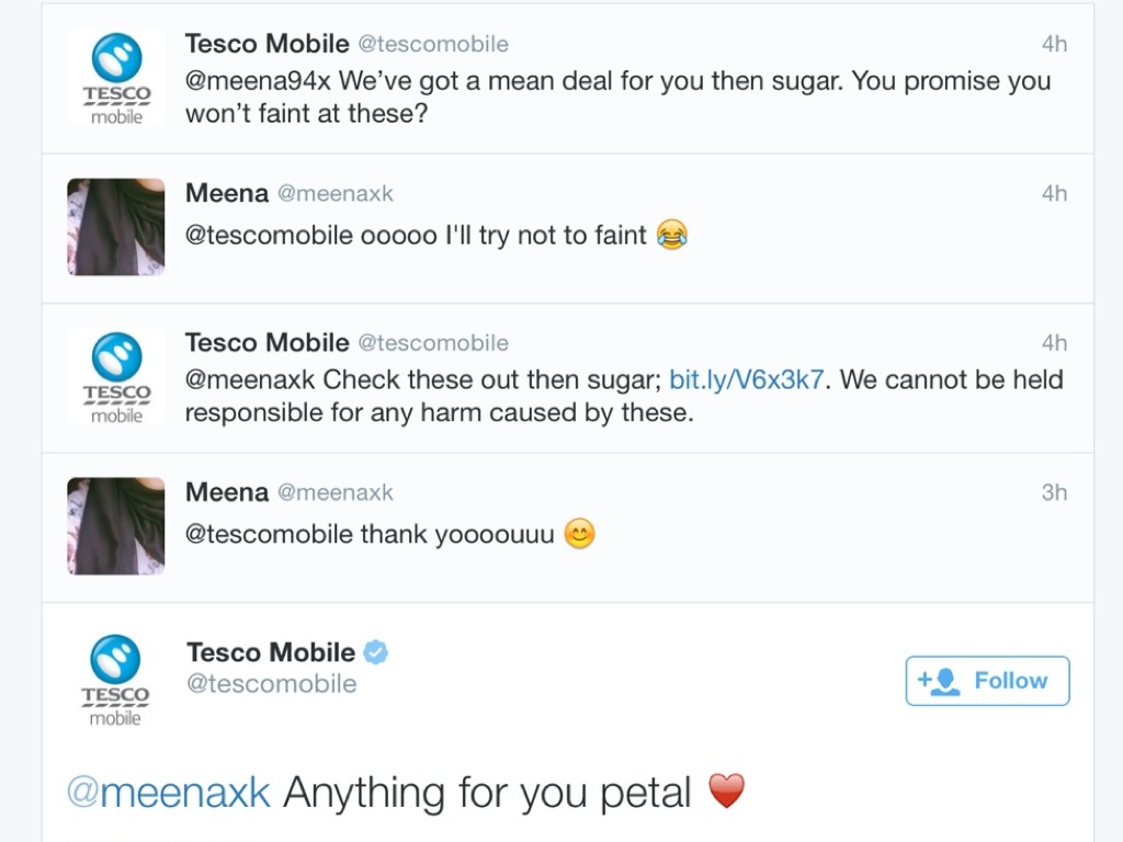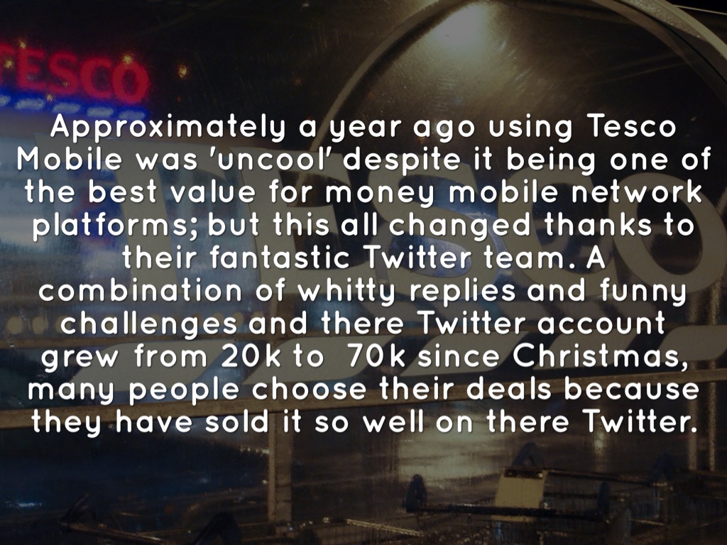 Approximately a year ago using Tesco Mobile was 'uncool' despite it being one of the best value for money mobile network platforms; but this all changed thanks to their fantastic Twitter team. A combination of whitty replies and funny challenges and there Twitter account grew from 20k to 70k since Christmas, many people choose their deals because they have sold it so well on there Twitter.