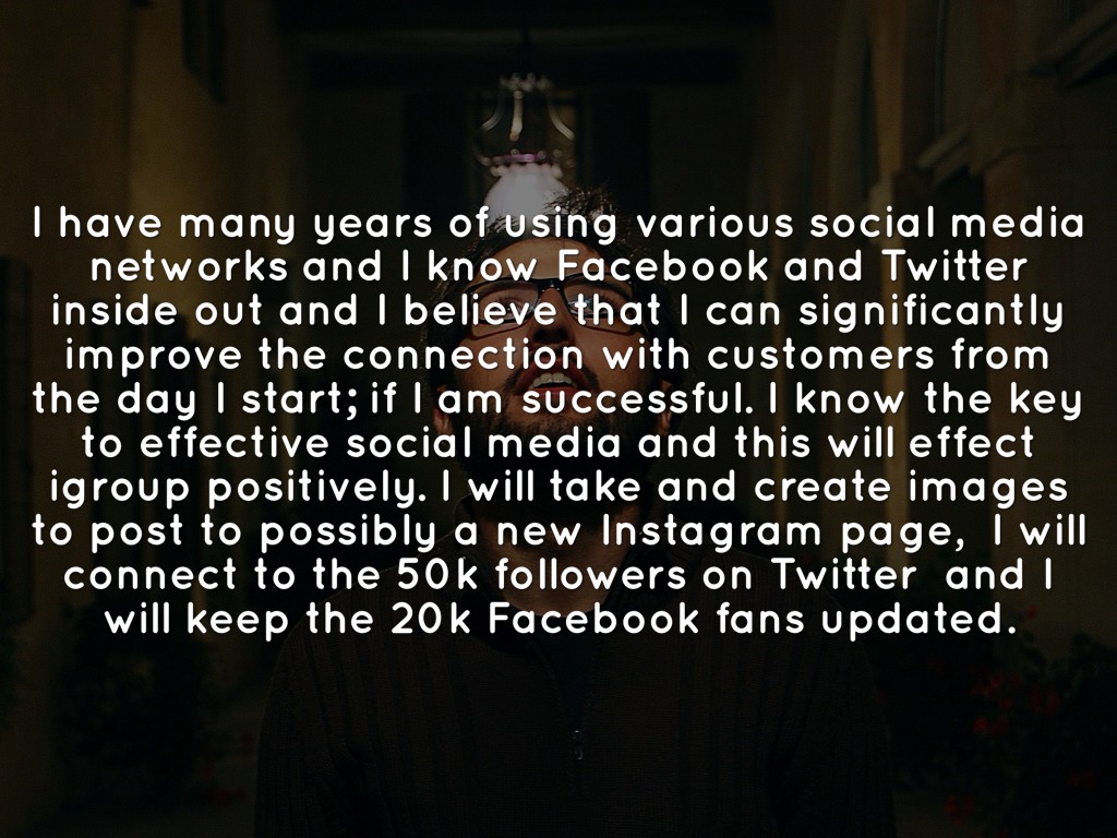 I have many years of using various social media networks and I know Facebook and Twitter inside out and I believe that I can significantly improve the connection with customers from the day I start; if I am successful. I know the key to effective social media and this will effect igroup positively. I will take and create images to post to possibly a new Instagram page, I will connect to the 50k followers on Twitter and I will keep the 20k Facebook fans updated.