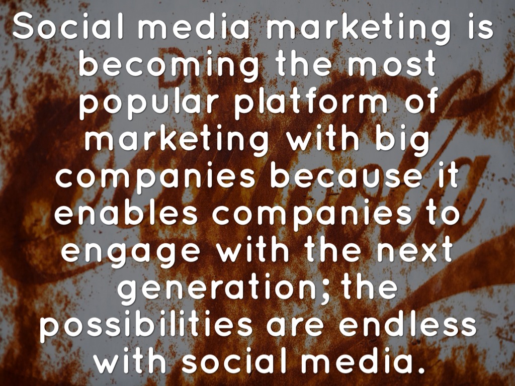 Social media marketing is becoming the most popular platform of marketing with big companies because it enables companies to engage with the next generation; the possibilities are endless with social media.