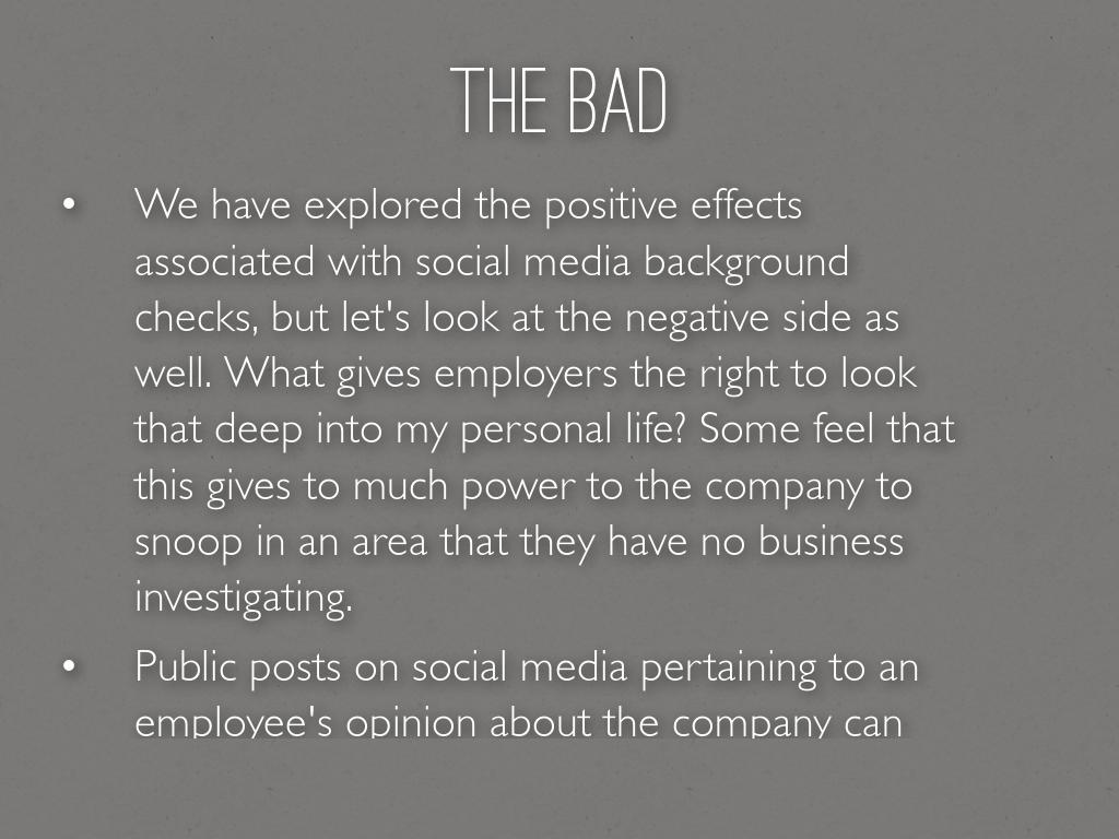 We have explored the positive effects associated with social media background checks, but let's look at the negative side as well. What gives employers the right to look that deep into my personal life? Some feel that this gives to much power to the company to snoop in an area that they have no business investigating.