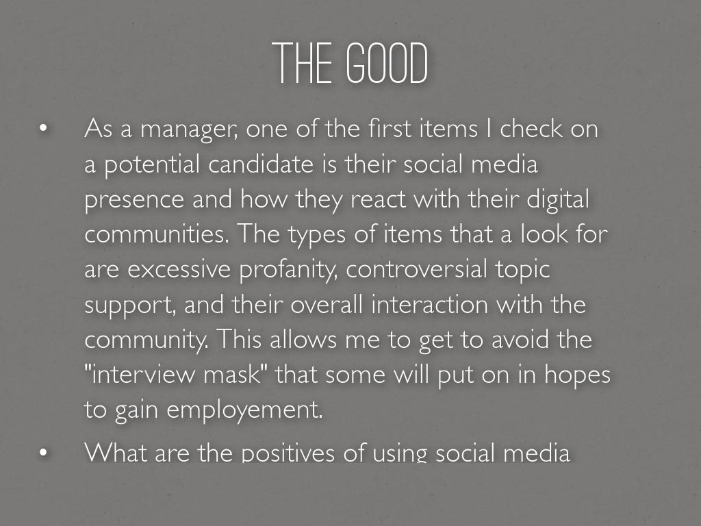 What are the positives of using social media before and during employment? First, you can gain a glimpse into their morals and how they will potentially interact with consumers. For instance, let's say that the DEA has an opening for an enforcement officer. John Smith has a clean background, excellent job history and on paper is the perfect candidate. When they check his social media accounts, they discover that he is strong supporter of marijuana and is often involved in controversial discussions about it's legality and use. While freedom of speech is a right, what kind of message would it send to the workforce if a DEA agent was a supporter of an illegal drug? T