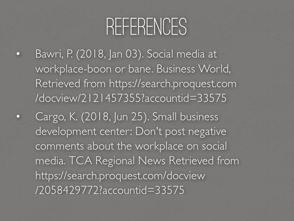 "What you post on social media could have serious repercussions on your professional life. It could cost you your current job or job opportunities in the future. According to a 2018 CareerBuilder survey, 70 percent of employers use social media to screen candidates during the hiring process, and about 43 percent of employers use social media to check on current employees. Managers look at social media accounts for an array of reasons, but many employers want to make sure a candidate will be a good fit with their company" (Driver, 2018