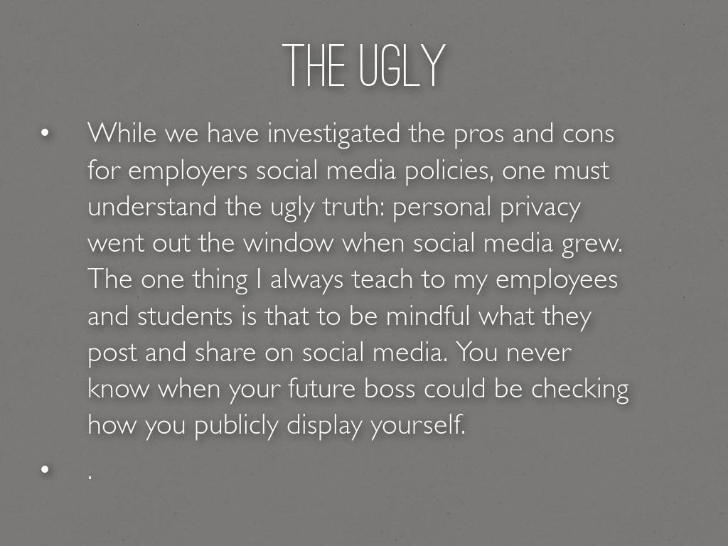 While we have investigated the pros and cons for employers social media policies, one must understand the ugly truth: personal privacy went out the window when social media grew. The one thing I always teach to my employees and students is that to be mindful what they post and share on social media. You never know when your future boss could be checking how you publicly display yourself.