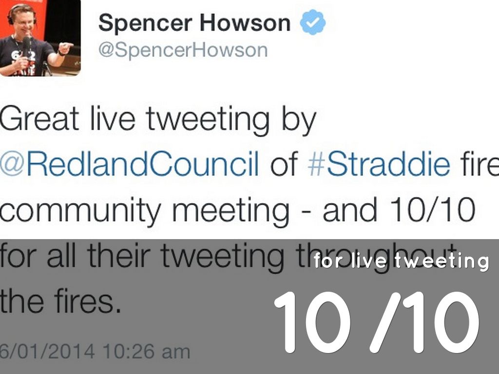 It was also nice to receive this tweet from Brisbane's best-known radio personality, Spencer Howson, giving us 10/10 for our live tweeting and other updates.