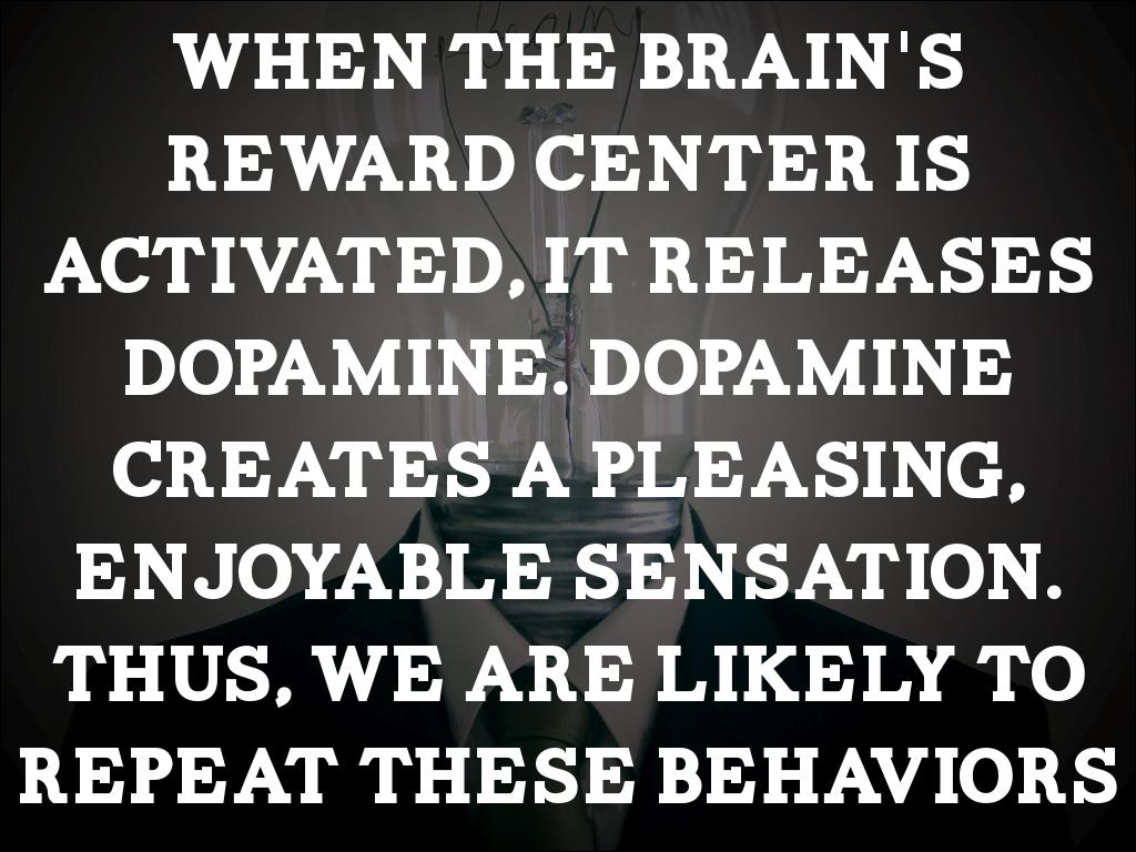 When the brain's reward center is activated, it releases dopamine. Dopamine creates a pleasing, enjoyable sensation. Thus, we are likely to repeat these behaviors