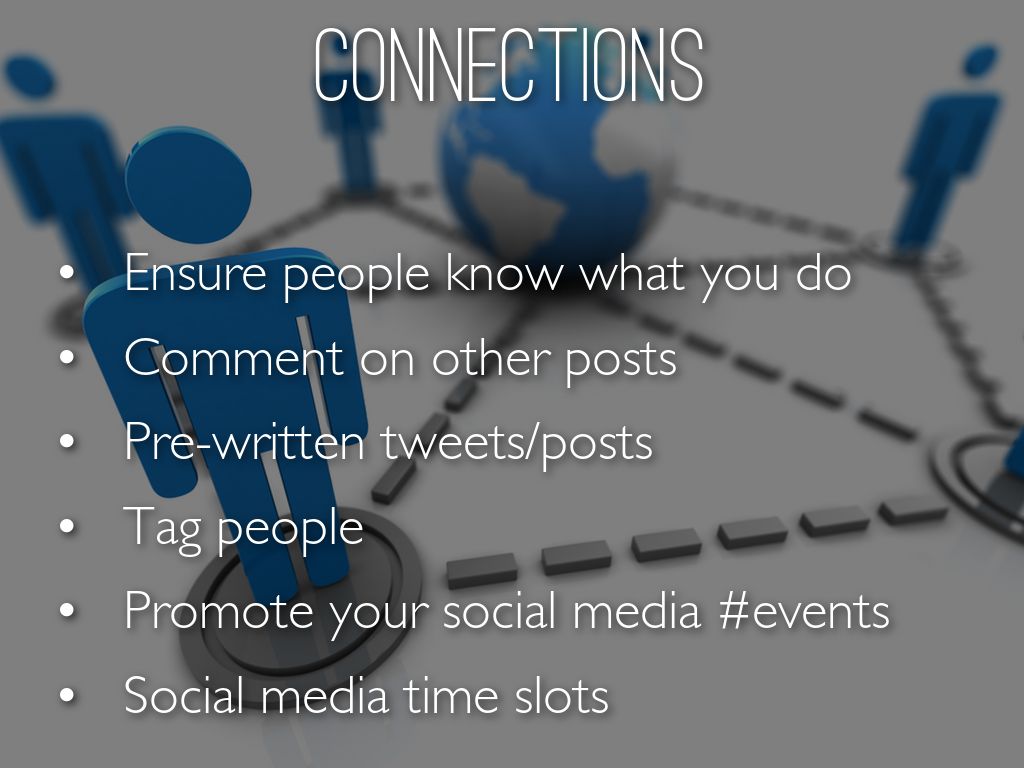 Tip: At events to ensure people are connecting with your social media, create small competitions such as, most retweets or best tweet of the day