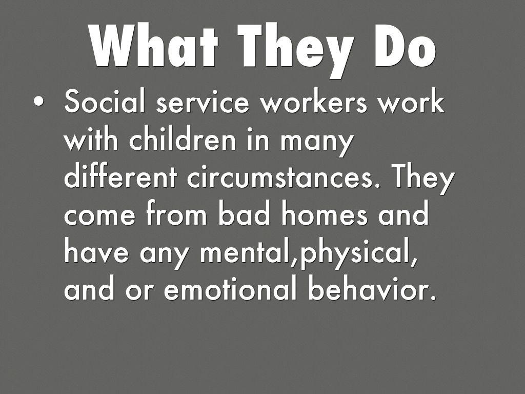 • Social service workers work with children in many different circumstances. They come from bad homes and have any mental,physical, and or emotional behavior.