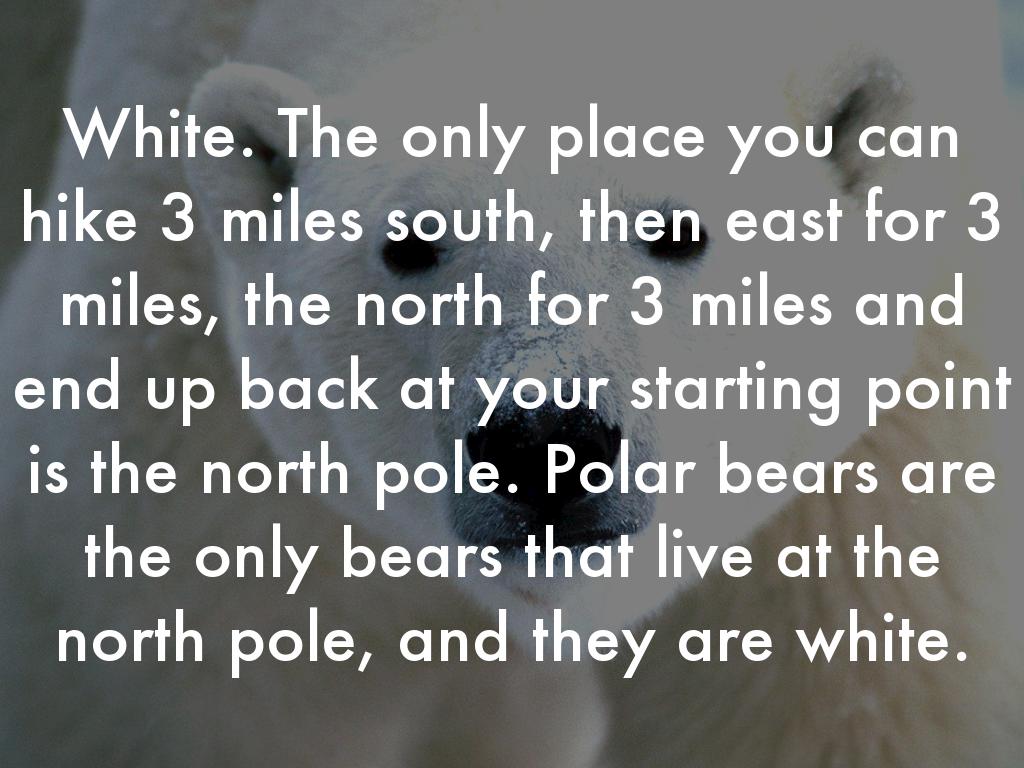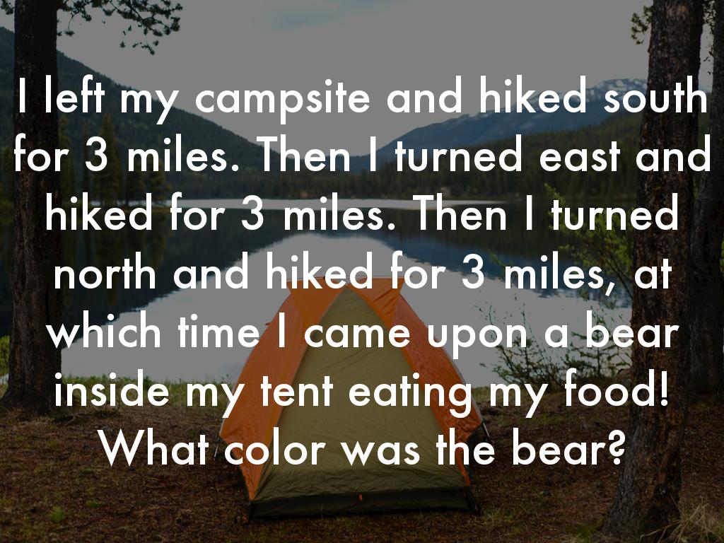 I left my campsite and hiked south for 3 miles. Then I turned east and hiked for 3 miles. Then I turned north and hiked for 3 miles, at which time I came upon a bear inside my tent eating my food! What color was the bear?