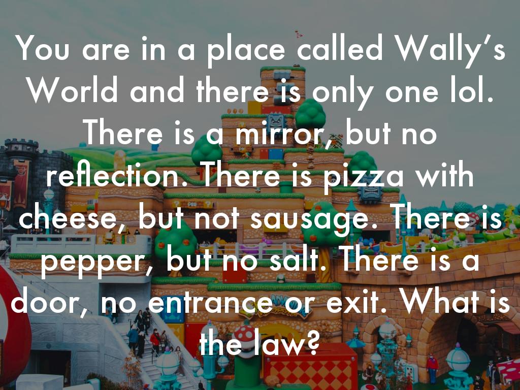 You are in a place called Wally’s World and there is only one lol. There is a mirror, but no reflection. There is pizza with cheese, but not sausage. There is pepper, but no salt. There is a door, no entrance or exit. What is the law?