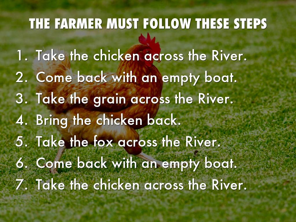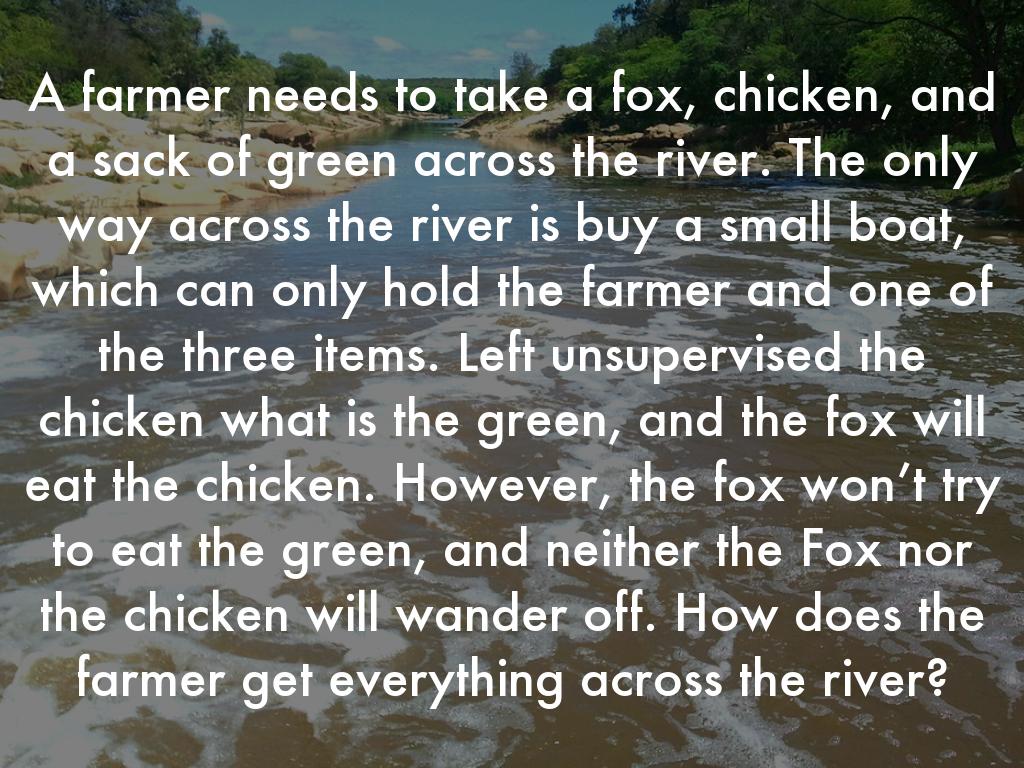 A farmer needs to take a fox, chicken, and a sack of green across the river. The only way across the river is buy a small boat, which can only hold the farmer and one of the three items. Left unsupervised the chicken what is the green, and the fox will eat the chicken. However, the fox won’t try to eat the green, and neither the Fox nor the chicken will wander off. How does the farmer get everything across the river?