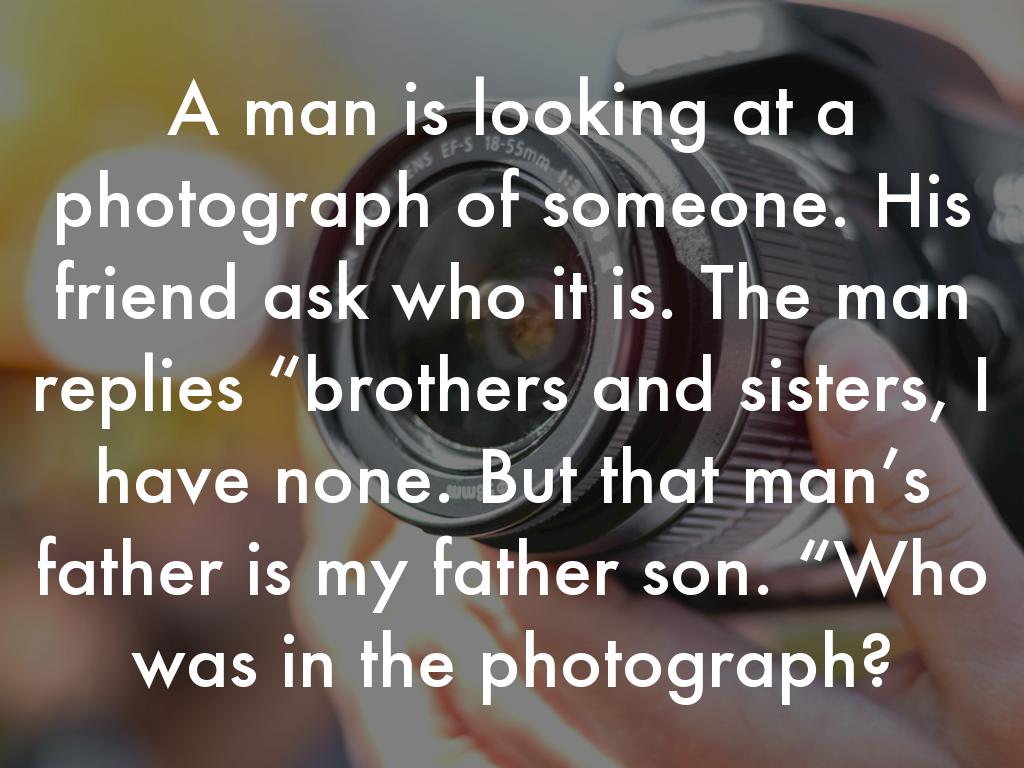 A man is looking at a photograph of someone. His friend ask who it is. The man replies “brothers and sisters, I have none. But that man’s father is my father son. “Who was in the photograph?
