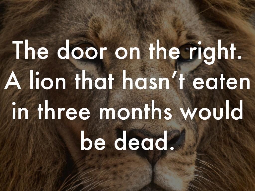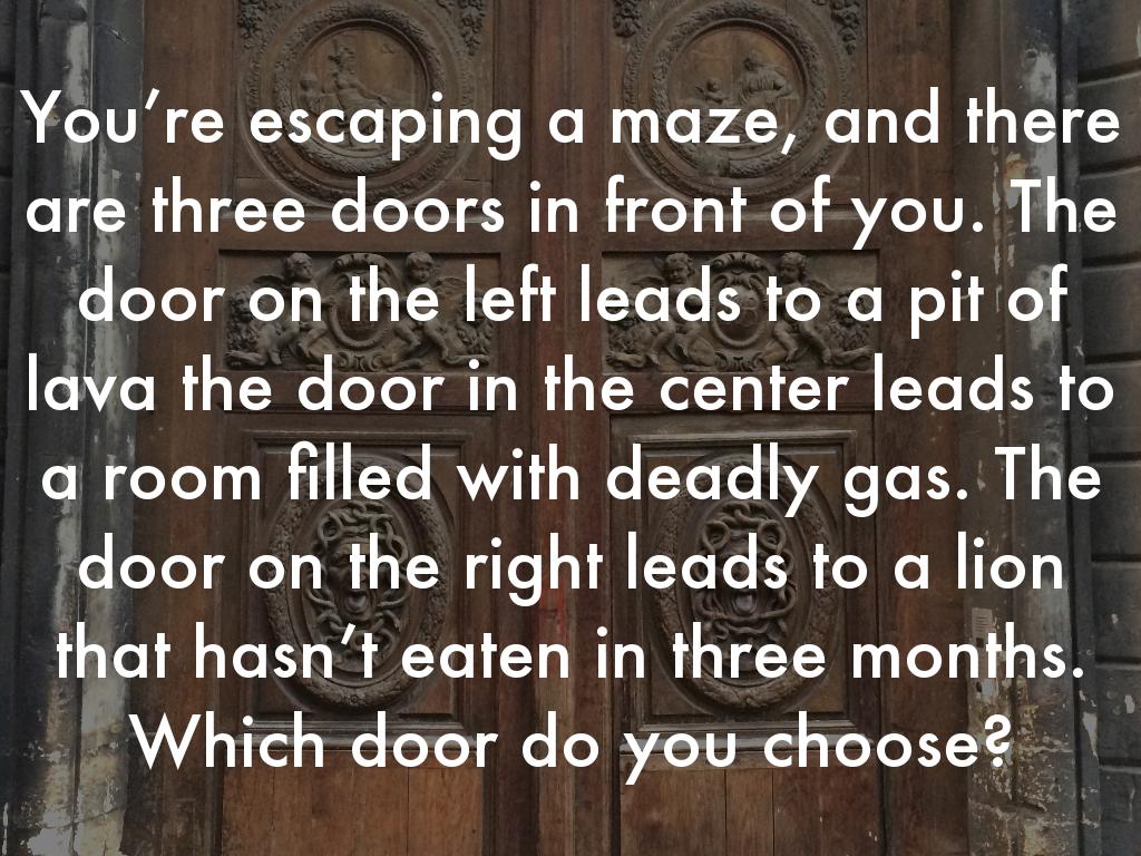 You’re escaping a maze, and there are three doors in front of you. The door on the left leads to a pit of lava the door in the center leads to a room filled with deadly gas. The door on the right leads to a lion that hasn’t eaten in three months. Which door do you choose?